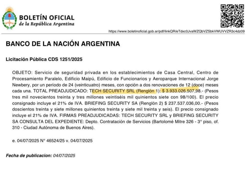 El portal A24.com publicó los términos de la licitación, donde consta que la búsqueda apuntaba a la provisión de un servicio de seguridad privada en los “establecimientos de Casa Central, Centro de Procesamiento Paralelo, Edificio Maipú, Edificio de Funcionarios y Aeroparque Internacional Jorge Newbery”, por un período de “24 meses, con opción a dos renovaciones de 12 meses cada una”.