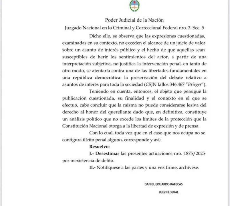 “Teniendo en cuenta, entonces, el objeto que persigue la publicación cuestionada, su finalidad y el contexto en el que se efectuó, cabe concluir que la misma no puede considerarse lesiva del derecho al honor del querellante dado que, en definitiva, constituye un análisis político que no excede los límites de la protección que la Constitución Nacional otorga a la libertad de expresión y de prensa”, señaló el juez.
