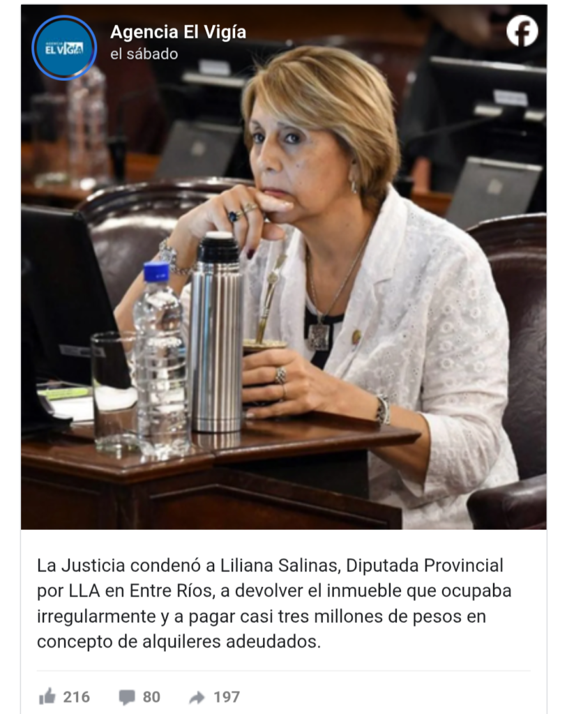 La Justicia condenó a Liliana Salinas, diputada provincial por La Libertad Avanza (LLA) en Entre Ríos, a restituir un inmueble que ocupaba de manera irregular y a abonar una suma cercana a los tres millones de pesos en concepto de alquileres adeudados.