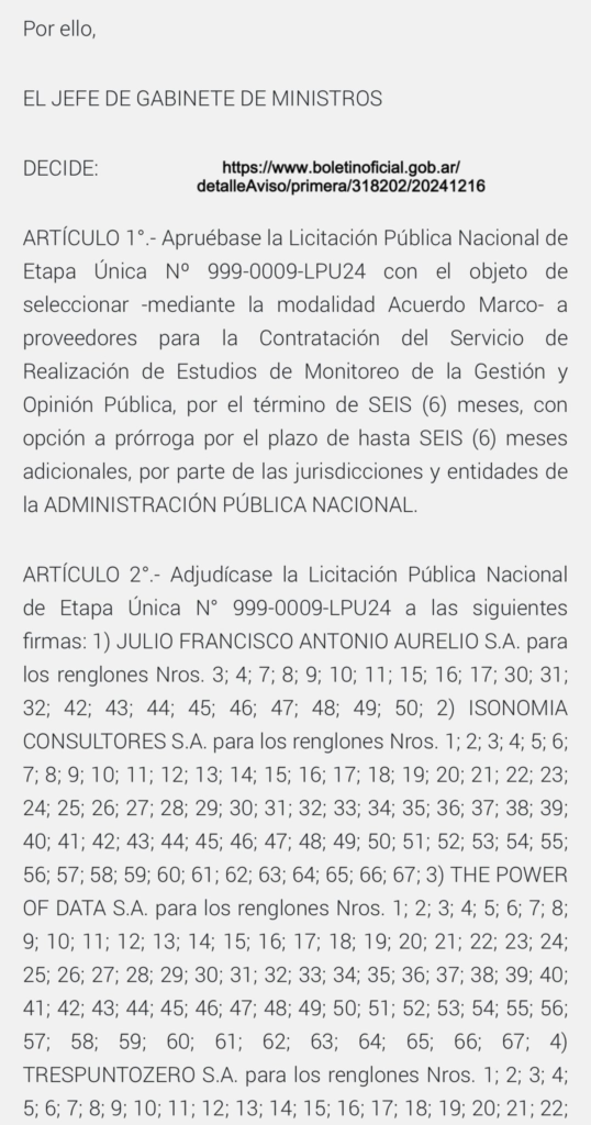 El 6 de febrero de 2024, en el Boletín Oficial, se publicó un llamado a licitación para “la Contratación del Servicio de Realización de Estudios de Monitoreo de la Gestión y la Opinión Pública por parte de las distintas jurisdicciones y entidades de la Administración Pública Nacional” por el término de un año.