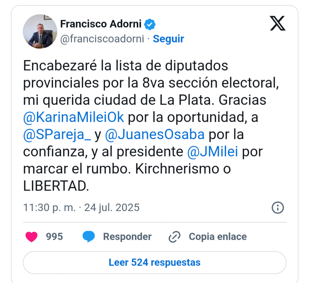 En una investigación que sacudió al espacio libertario, se confirmó que Francisco Adorni, actual primer candidato a diputado bonaerense por La Libertad Avanza (LLA) en la Octava Sección Electoral, mantuvo vínculos formales con el peronismo.