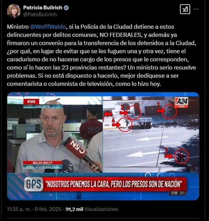 La ministra de Seguridad de la Nación, Patricia Bullrich, cuestionó duramente al ministro de Seguridad de la Ciudad, Waldo Wolff, luego de sus declaraciones sobre la fuga de seis presos de la Comisaría Vecinal 6 A de Caballito. En sus redes sociales, Bullrich le exigió a Wolff asumir responsabilidades y dejó fuertes críticas a su gestión.