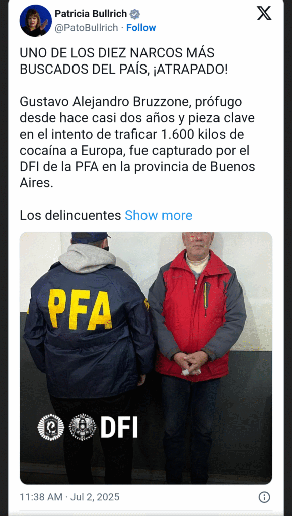“UNO DE LOS DIEZ NARCOS MÁS BUSCADOS DEL PAÍS, ¡ATRAPADO! Gustavo Alejandro Bruzzone, prófugo desde hace casi dos años y pieza clave en el intento de traficar 1.600 kilos de cocaína a Europa, fue capturado por el DFI de la PFA en la provincia de Buenos Aires. Los delincuentes encuentran impunidad y refugio en PBA. Mientras unos miran para otro lado, nosotros los buscamos, los encontramos y los hacemos pagar”, sostuvo la funcionaria a través de sus redes sociales.