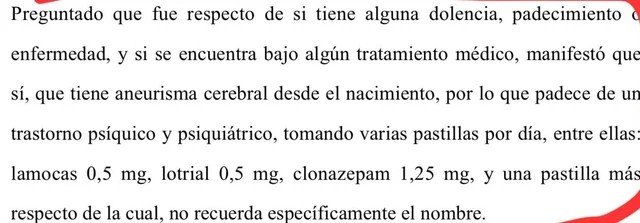Ante el magistrado, Bruzzone afirmó que “tiene un aneurisma cerebral desde su nacimiento, por lo que padece de un trastorno síquico y siquiátrico, tomando varias pastillas por día, entre ellas: lamoca 0,5 mg.; lotrial 0,5 mg.; clonazepam 1,25 mg.; y una pastilla más respecto de la cual no recuerda específicamente el nombre”.