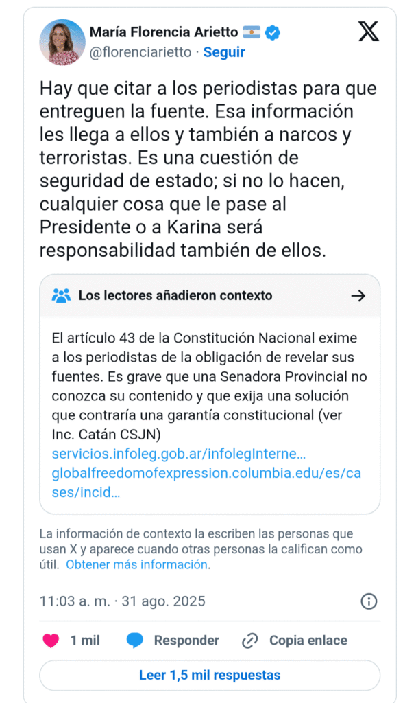 En su publicación, Arietto acusó a los medios y periodistas de poner en riesgo a Javier y Karina Milei por difundir datos vinculados a la seguridad presidencial. Bajo esa premisa, sugirió que quienes publican esa información deberían revelar sus fuentes. El mensaje encendió críticas, ya que desconoce la función del periodismo y las garantías constitucionales que lo amparan en Argentina.