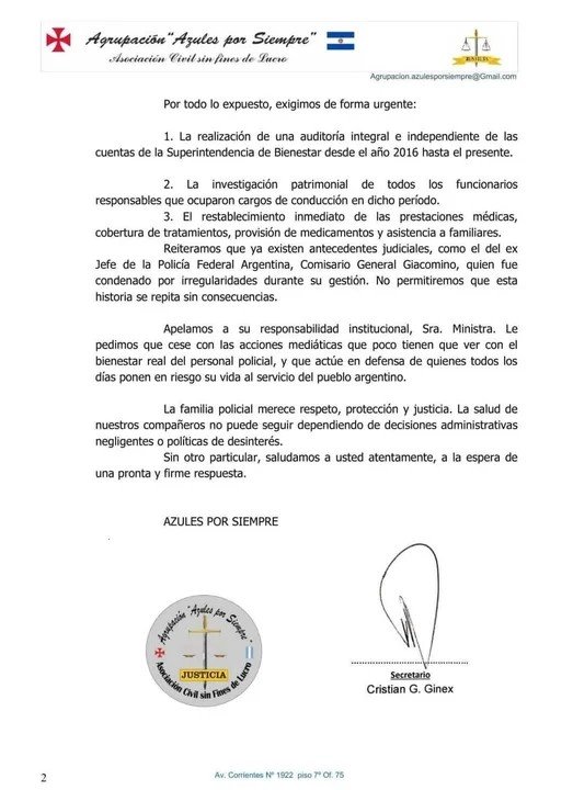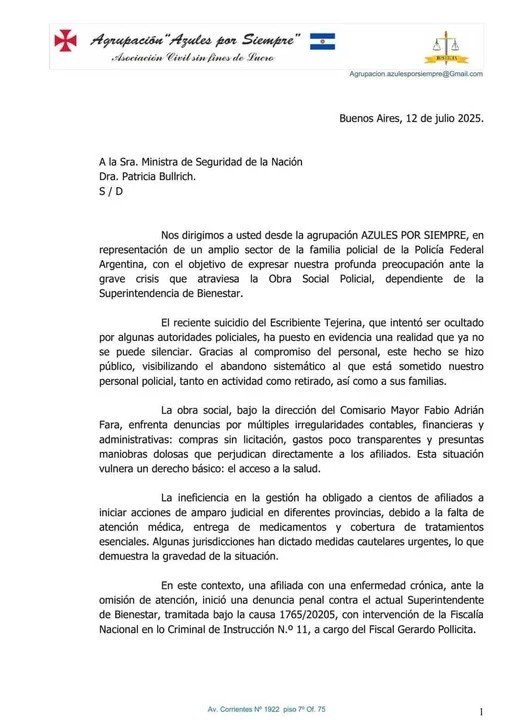 Nos dirigimos a usted desde la agrupación AZULES POR SIEMPRE, en representación de un amplio sector de la familia policial de la Policía Federal Argentina, con el objetivo de expresar nuestra profunda preocupación ante la grave crisis que atraviesa la Obra Social Policial, dependiente de la Superintendencia de Bienestar.