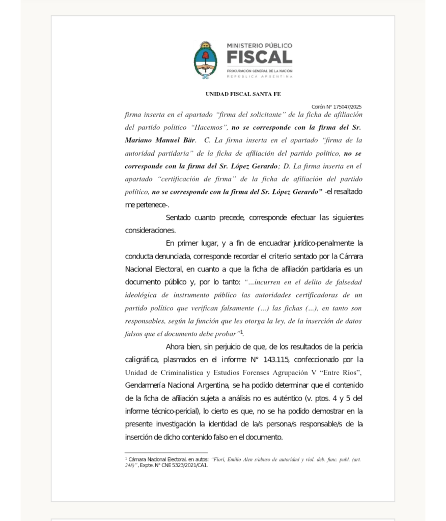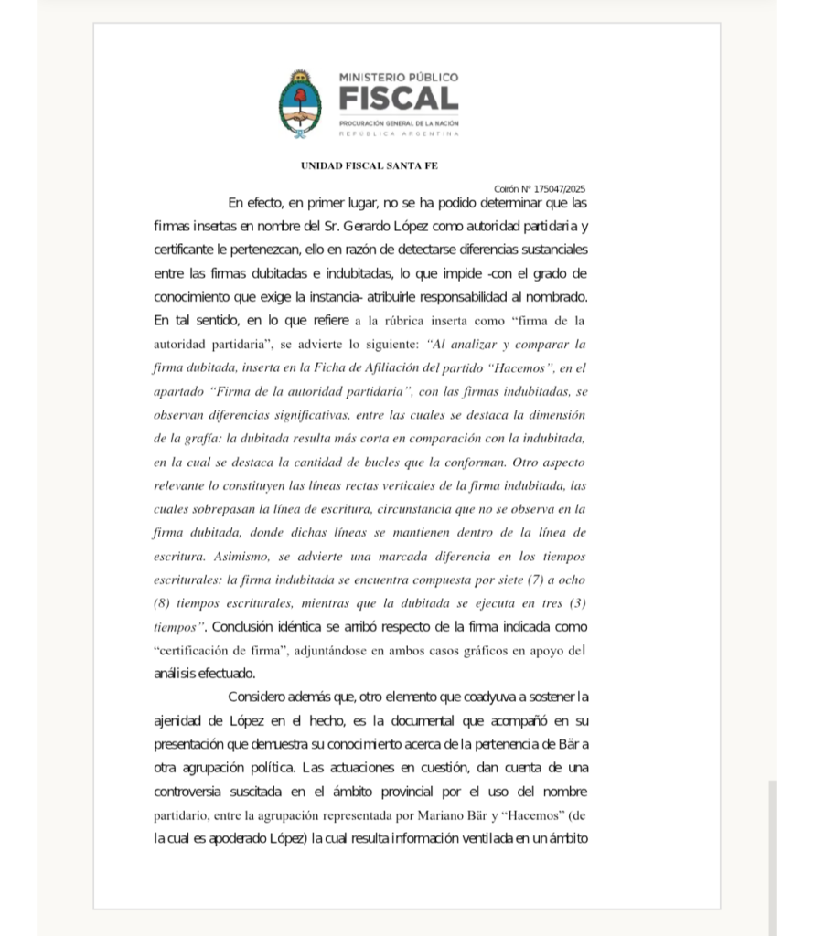 Además, señala que “López, en su carácter de apoderado y autoridad certificante del partido no puede válidamente invocar la falsificación de su firma como fundamento para neutralizar la investigación” porque “asume un deber específico de control y resguardo de dichos instrumentos”.