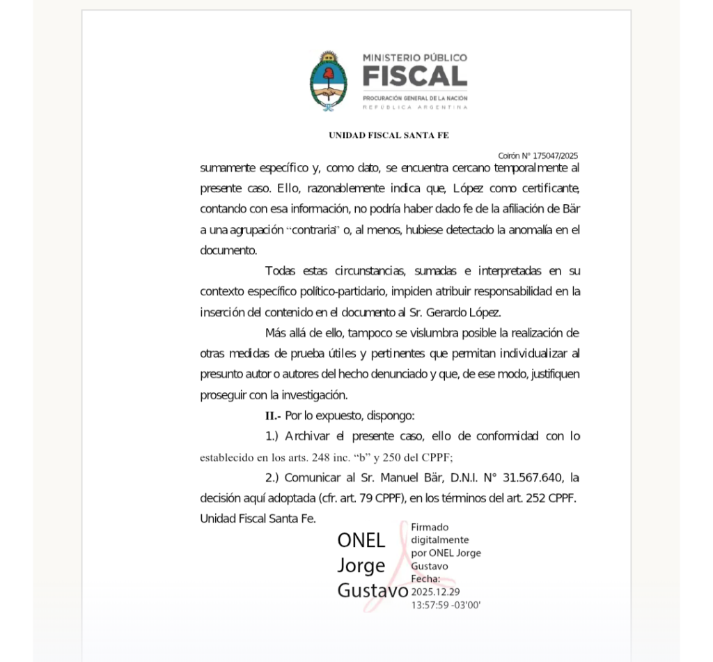 Pese a que la Fiscalía Federal reconoció que la ficha de afiliación es un documento público falso, decidió archivar la causa al considerar que no logró identificar a los autores materiales de la maniobra y que no había medidas inmediatas para avanzar mandando la denuncia a archivo.