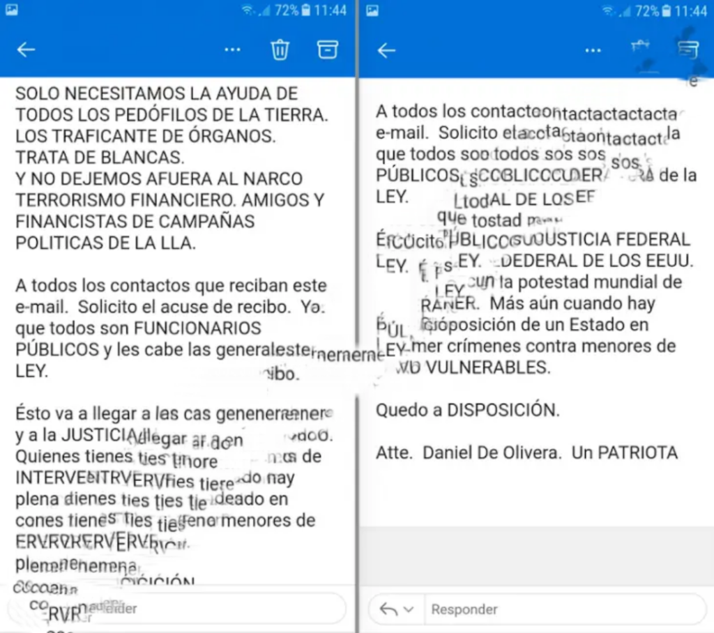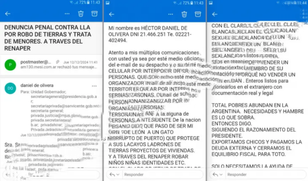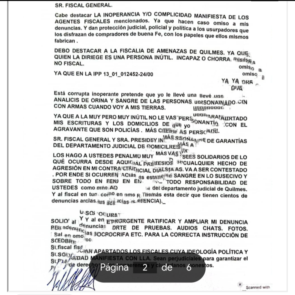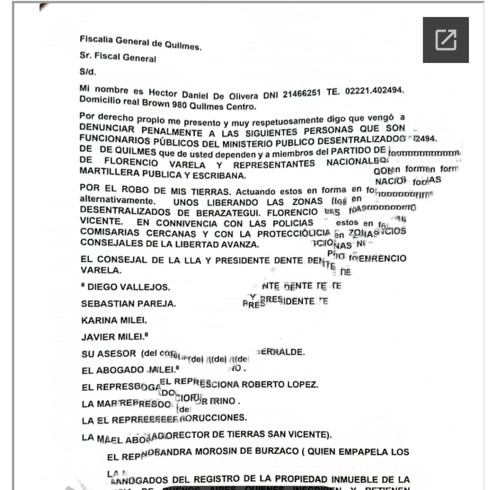 La última instancia fue la vía legal. De Olivera presentó un escrito ante la fiscalía General de Quilmes en contra de Sebastián Pareja, Karina Milei, Javier Milei, Antonio Insaurralde, Diego Vallejos y otros importantes partícipes necesarios que conoció durante estos idas y vueltas que terminaron con la sustracción de sus tierras.
