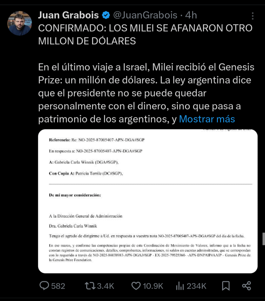 “Confirmado: los Milei se afanaron otro millón de dólares”, dijo Grabois en sus redes, donde mencionó al Presidente y a su hermana Karina.
