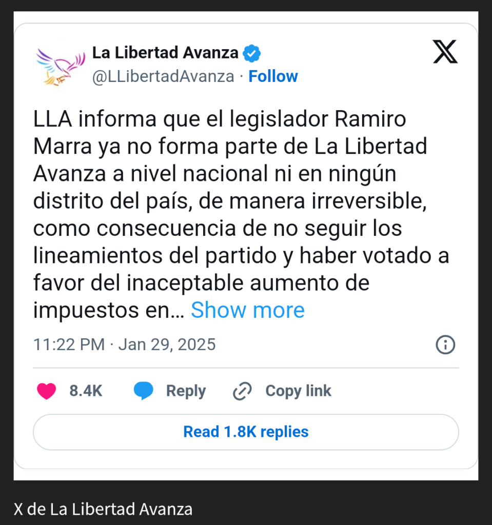 En ese sentido, el oficialismo precisó: “LLA informa que el legislador Ramiro Marra ya no forma parte de La Libertad Avanza a nivel nacional ni en ningún distrito del país, de manera irreversible, como consecuencia de no seguir los lineamientos del partido y haber votado a favor del inaceptable aumento de impuestos en la Ciudad de Buenos Aires, que contradice los ideales del presidente Javier Milei”.