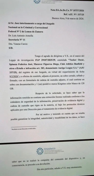 Los peritos dejaron bien en claro que no podía realizarse análisis alguno ante el estado comprometido en que llegó la prueba y así se lo comunicaron al juzgado federal. “Hace saber que la información remitida no contiene una extracción forense realizada conforme a los estándares de seguridad de la información, preservación de evidencia digital y cadena de custodia que rigen en la materia, ni bajo los protocolos técnicos aplicados por esta Dirección para el tratamiento de evidencia digital”, recalcaron en la nota remitida el 9 de marzo.