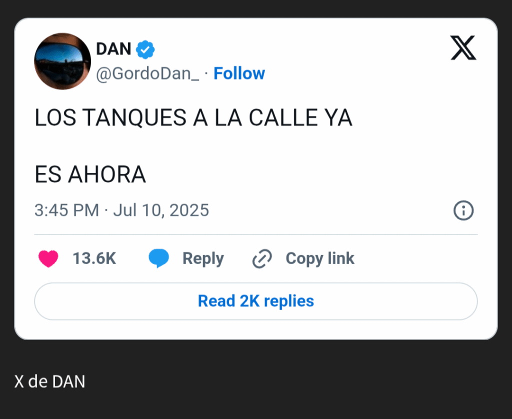 “Es ahora Javo. Metan todos los tanques adentro del Congreso”, publicó @elpittttt, en otro de los posteos referidos. También fue señalado Daniel Parisini, conductor del streaming La Misa y conocido como “El Gordo Dan”, por haber pedido “sacar los tanques a la calle” y sobrevolar el Parlamento con los aviones F16 recientemente adquiridos por el Ministerio de Defensa.