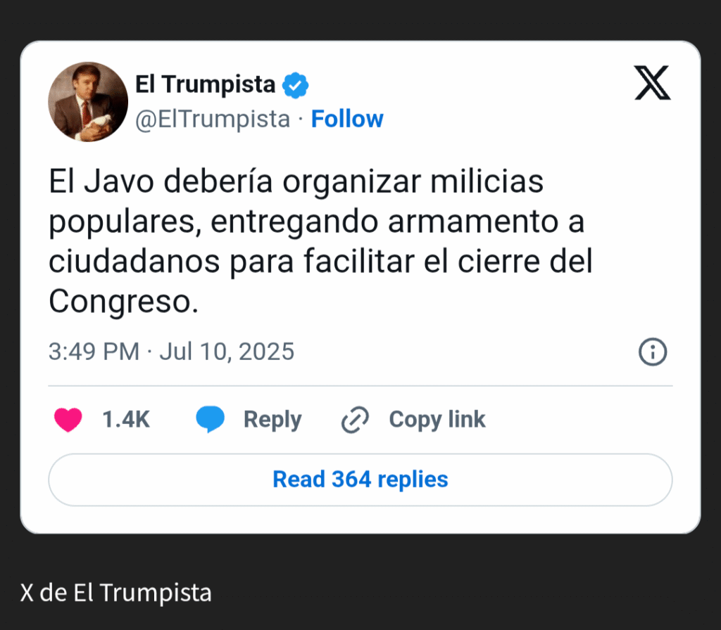 Los mensajes apuntados se difundieron en la red social X (antes Twitter) mientras la Cámara alta debatía temas sensibles. Desde cuentas con miles de seguidores, varios usuarios libertarios plantearon consignas de extrema violencia. “El Javo debería organizar milicias populares, entregando armamento a ciudadanos para facilitar el cierre del Congreso”, escribió @ElTrumpista, atribuida en la denuncia a Luciano Cabrera.