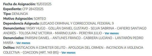 La presentación judicial recayó en el Juzgado Criminal y Correccional Federal N° 9, bajo la órbita de María Eugenia Capuchetti, y lleva las firmas de Hugo Yasky, Daniel Gollán, Sabrina Selva, Santiago Cafiero, Victoria Tolosa Paz, Juan Marino y Julio Pereyra. En el escrito, los legisladores advierten que los posteos constituyen un claro intento de “atentar contra el orden constitucional”.