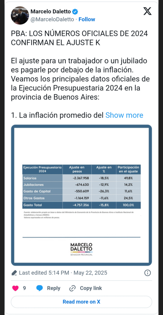 “El 64% del ajuste recayó sobre la masa salarial y jubilatoria, que cayeron 18,5% y 12,9%, respectivamente, por debajo de la inflación”, indicó Daletto. En ese marco, planteó que “la totalidad del gasto de la Provincia en 2024 fue de $25,39 billones, mientras que en 2023 fue de $9,42 billones, variando un 169,4%”