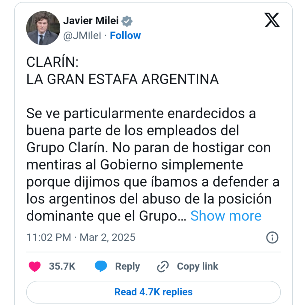Javier Milei decidió extremar la pelea con el Grupo Clarín a niveles que no se veían desde la pelea por la ley de medios de Cristina Kirchner. “Clarín: la gran estafa argentina”, tituló el presidente un largo texto que publicó en X y dejó fijado al tope de su timeline. La frase expone además la molestia del Presidente por la cobertura del caso Libra, que no cede.