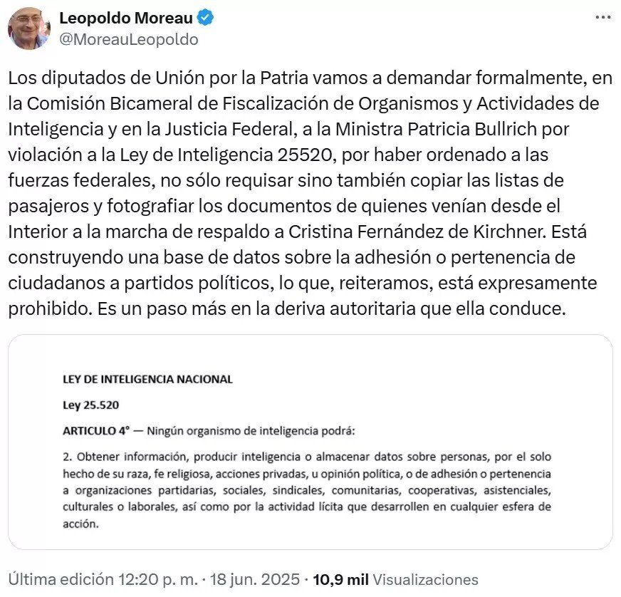 “Los diputados de Unión por la Patria vamos a demandar formalmente, en la Comisión Bicameral de Fiscalización de Organismos y Actividades de Inteligencia y en la Justicia Federal, a la ministra Patricia Bullrich por violación a la Ley de Inteligencia 25520, por haber ordenado a las fuerzas federales, no sólo requisar sino también copiar las listas de pasajeros y fotografiar los documentos de quienes venían desde el Interior a la marcha de respaldo a Cristina”, escribió el legislador, en un tuit en el que adjuntó también una imagen del Artículo 4 de la citada norma.