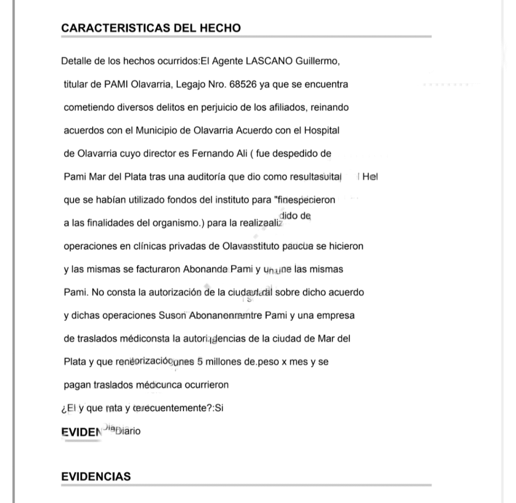 Una nueva denuncia anónima registrada bajo el identificador M4JV8YHS y radicada en la UFI Nro. 10 descentralizada de Olavarría, perteneciente al departamento judicial Azul, pone en evidencia un nuevo caso de presunta corrupción dentro del PAMI. El acusado es Guillermo Lascano, titular de la sede local del organismo que conduce Esteban Leguizamo, con legajo 68526, quien habría montado un esquema sistemático de desvío de fondos públicos a través de acuerdos irregulares con prestadores médicos y empresas de traslados sanitarios.