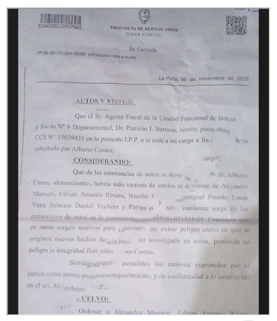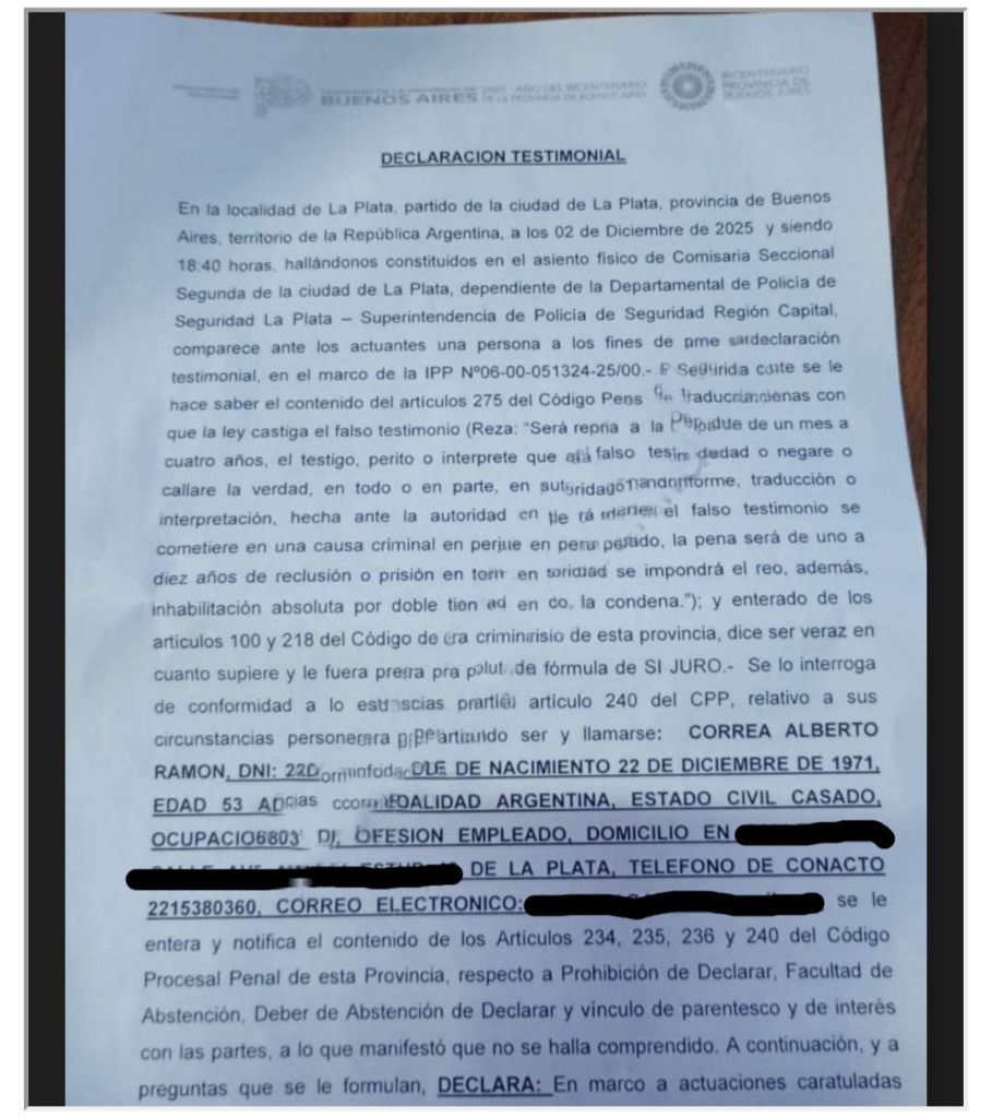Según consta en la declaración testimonial realizada hoy a las 18.40, Correa denunció que uno de los integrantes del grupo—Miguel Prátola—se acercó a menos de 20 metros de su domicilio, infringiendo la prohibición dictada por el juzgado de Garantías Nro. 4 de La Plata el pasado 6 de noviembre.