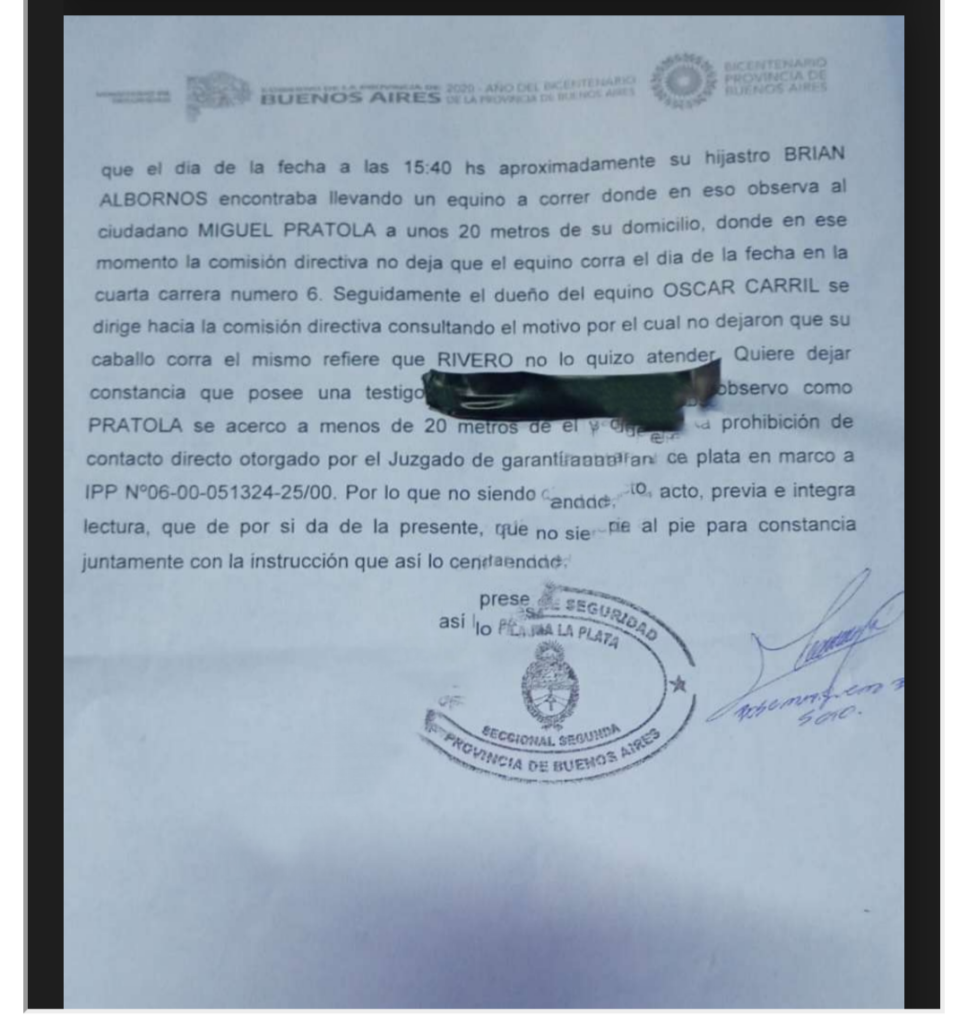 El testimonio agrega que el episodio ocurrió alrededor de las 15.40, cuando un equino del cuidador era llevado a correr. Un testigo presencial observó el acercamiento de Prátola, pese a que el magistrado había sido categórico al ordenar el cese del hostigamiento, la prohibición de intimidación, y la prohibición de cualquier tipo de contacto, directo o indirecto, mientras dure el proceso penal.