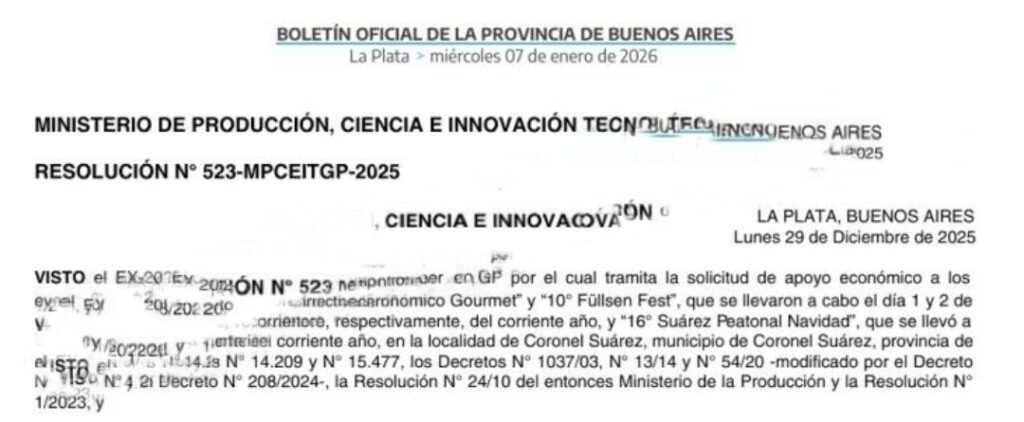 La situación surge a partir de la resolución Nro. 523-MPCEITGP-2025, firmada por el gobernador Axel Kicillof el 29 de diciembre de 2025, mediante la cual se otorgó un “apoyo económico” de 15 millones de pesos a la municipalidad de Coronel Suárez para la realización de dos eventos culturales y gastronómicos. El problema es que, para ese entonces, los eventos ya habían concluido.