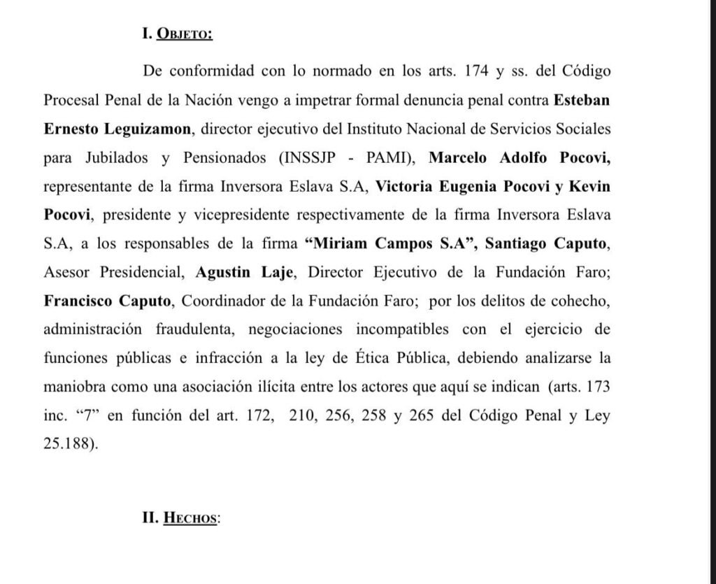 El caso se originó a partir de una contratación del PAMI a la firma Eslava S.A., propiedad de los Pocovi, para el alquiler de un piso para ubicar un callcenter. La compulsa de $65 millones fue otorgada a la familia sin importar que Kevin Pocovi, vice de la empresa, era muy cercano al Gobierno e incluso había viajado con Milei a Miami en una de sus giras oficiales a Estados Unidos. Lo más llamativo es que, según trascendió, el proyecto se demoró y mientras tanto lo que se instaló en el edificio fue un lujoso búnker libertario. Los detalles fueron publicados por Diagonales en marzo.