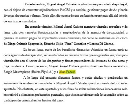 Junto a ello, también era esencial su vínculo con la dupla Calvete – Muñoz. Al respecto, la Fiscalía deduce a raíz de los chats que Pocovi “recibía dinero tanto de Miguel Ángel Calvete como de otras personas que estarían vinculadas a ortopedias o firmas proveedoras de insumos a la ANDIS”. Por su parte, la acusada “se encargaba de recibir los cheques provenientes de las empresas y de remitirlos a Alan Pocovi con el objeto de que él procediera a movilizar los fondos”.