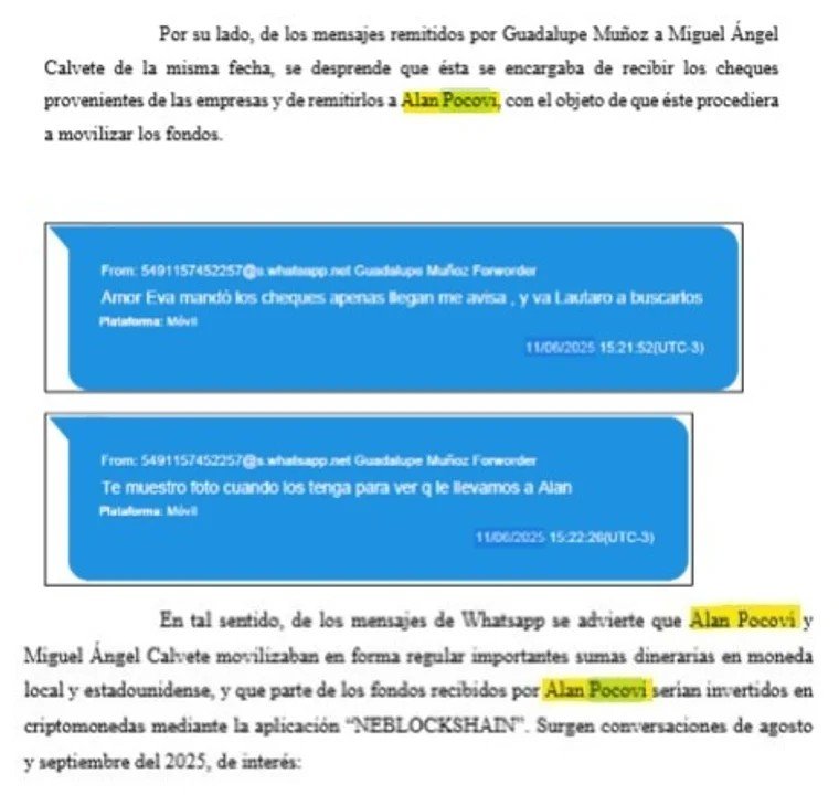 - En junio de este año, por ejemplo, Muñoz le cuenta a Calvete que están esperando “los cheques” y adelanta: “Te muestro foto cuando los tenga para ver qué le mandamos a Alan [Pocovi]”.