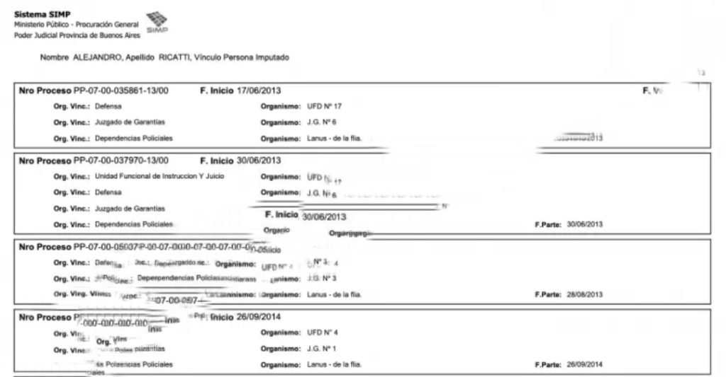 La totalidad de ellas están registradas dentro del sistema SIMP, del ministerio Público Fiscal y del poder judicial de provincia de Buenos Aires. La primera denuncia que se hizo contra Ricatti fue en Lanús, en el 2013, en la UFD 17 (ahora UFIJ 17). Allí, se lo acusa de ejercer violencia de género; apenas trece días después, el 30 de junio del mismo año, la víctima volvió a denunciar al ahora consejero libertario, pero en esta oportunidad por el delito de agresiones sexuales (UFIyJ 9).