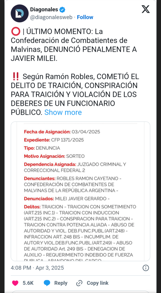 Es que la Confederación de Combatientes de Malvinas de la Argentina, una importante organización que nuclea a veteranos que lucharon en las guerra 43 años atrás, presentó una gravísima denuncia penal contra Milei por una larga serie de delitos relativos a sus escandalosas declaraciones, entre ellos traición a la Patria, traición con sometimiento, conspiración para traición, traición contra potencia aliada, abuso de autoridad y violación de los deberes de funcionario público.