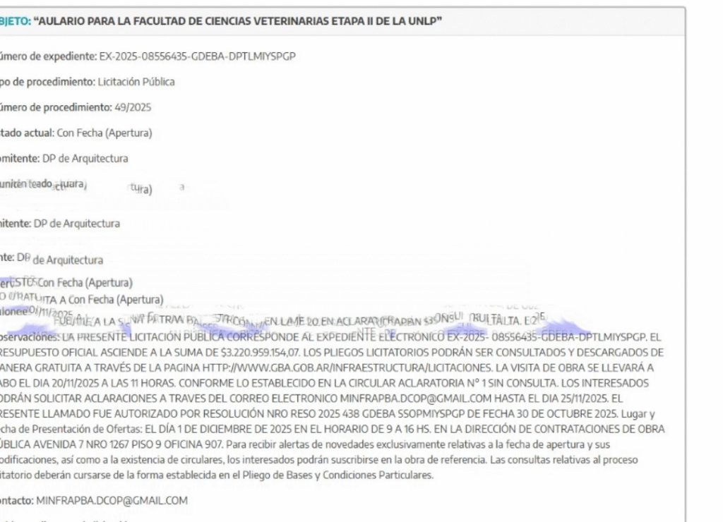 En un escenario marcado por una crisis social y económica como pocas veces se vio en la provincia de Buenos Aires, el gobierno de Axel Kicillof avanzó con una nueva licitación pública por más de $3.220 millones destinada a construir el Aulario para la Facultad de Ciencias Veterinarias – Etapa II de la Universidad Nacional de La Plata (UNLP).
